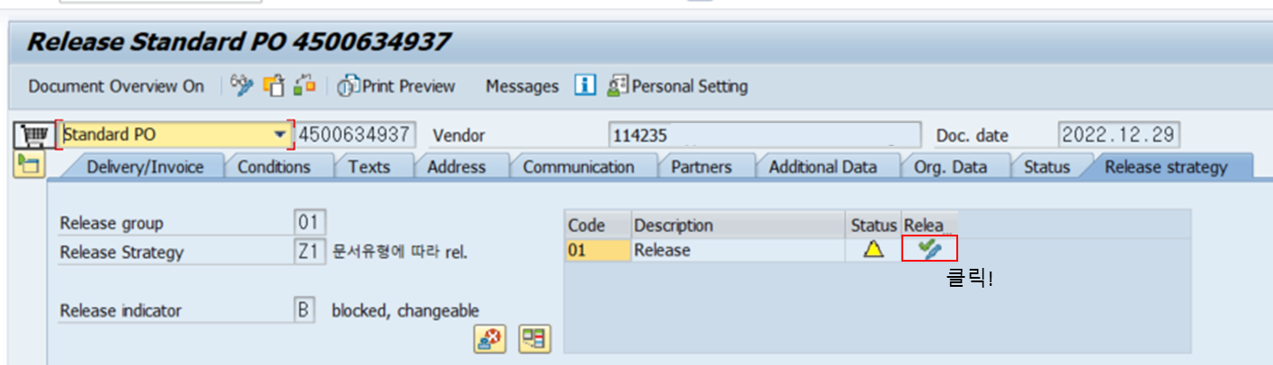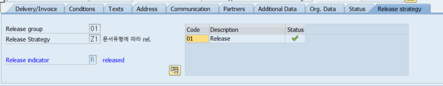 위와 같이 용도에 맞게 입력 후, 저장한 다음 T-Code: ME29N에서 Release를 한다.