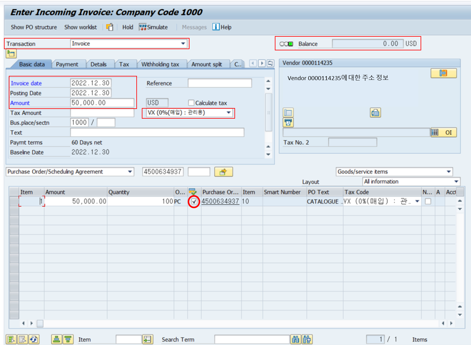 Invoice Date, Posting Date 매입세금계산서 날짜 입력 후, 금액, 세금코드 확인하여 세금이 있으면 세액까지 입력해주세요