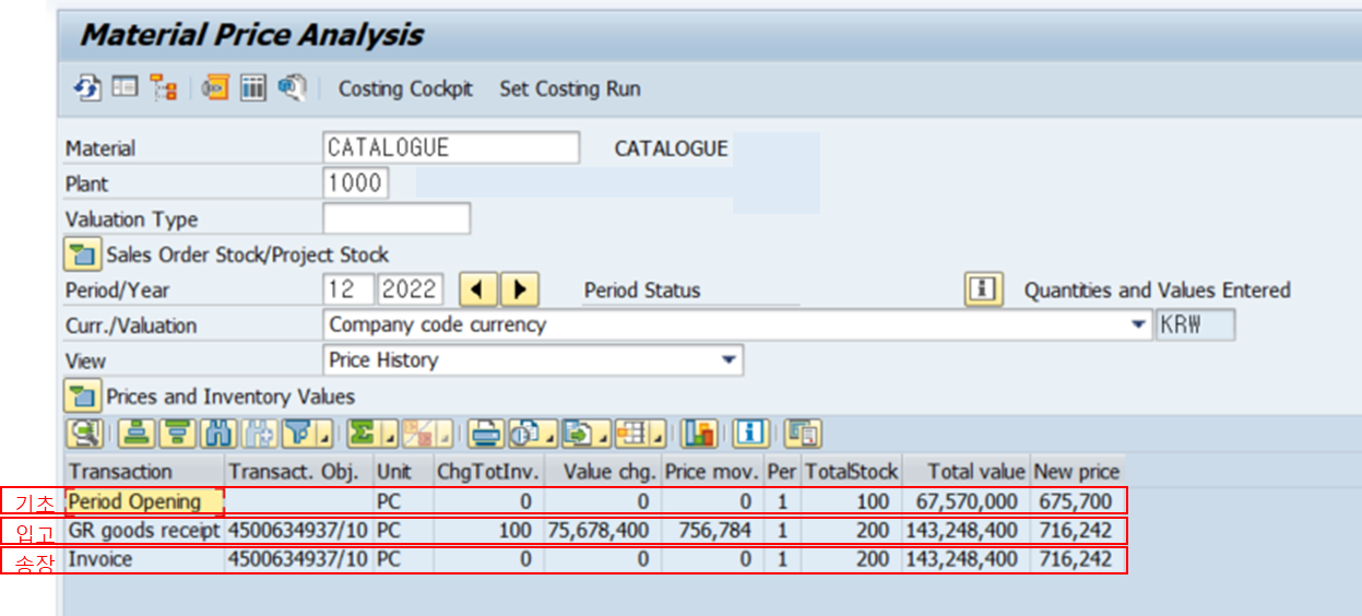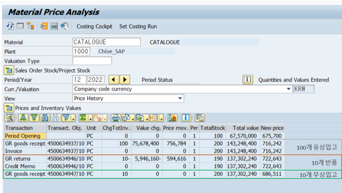 이전 포스팅에서 자재코드 CATALOGUE 를 플랜트 1000으로 100개/USD 50,000(KRW 75,678,400) 입고 및 송장 처리 하였다.