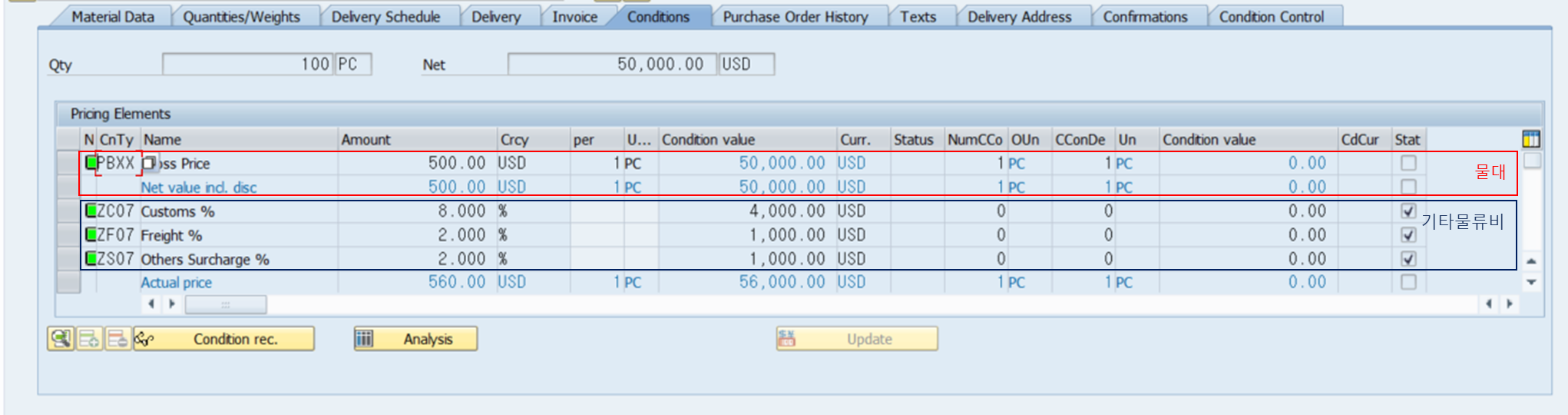 Delivery Costs의 금액 발생은 Conditions에서 정의된 대로 금액이 발생
