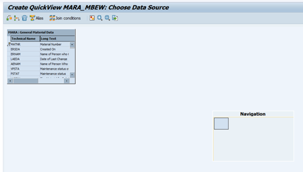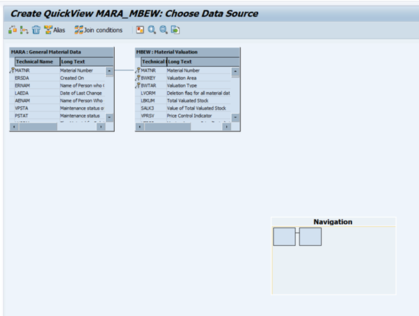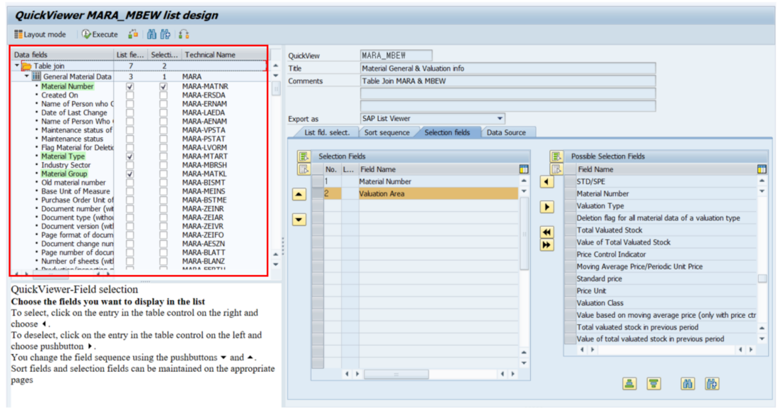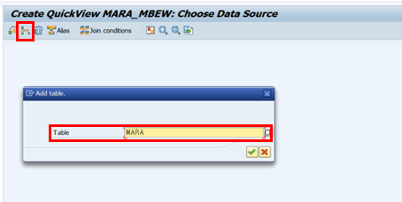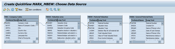 이번 예시는 테이블 MARA의 Material Type, Material Group 정보와 테이블 MBEW에 있는 Valuation Area, Valuation Type, Price Control, Valuation Class를 합쳐서 하나의 화면에서 볼 수 있도록 만드는 것이다.