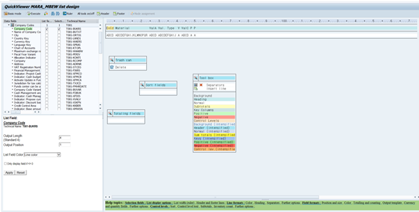 오른쪽에서 결과화면의 레이아웃이 보이고, 변경하고자 하는 필드를 더블클릭하면 왼쪽하단에 필드에 대한 길이, 위치가 나오고, 수정을 하여 레포트를 조정할 수 있다.