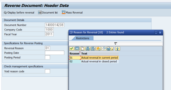 여기서는 원전표와 같은 기표일자로 할 것이기 때문에, Reversal Reason은 01 그리고, Posting Date, Posting Period는 빈칸으로 두고 Enter!
