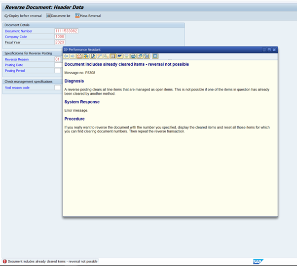 T-Code: FB08에서 반제전표를 입력하고 저장버튼을 누르면 아래와 같은 에러메시지가 발생한다.