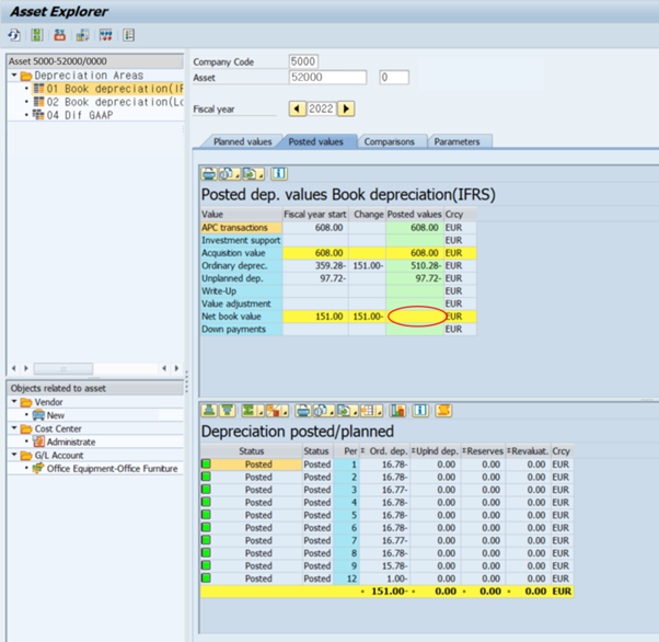AFAR 실행 후, 자산탐색기에서 해당 자산을 조회하면, 더 이상의 팝업창은 뜨지 않고, 감가상각에 Planned가 뜨면서 원래의 감가상각누계액으로 돌아오는 것을 확인 할 수 있다.