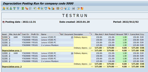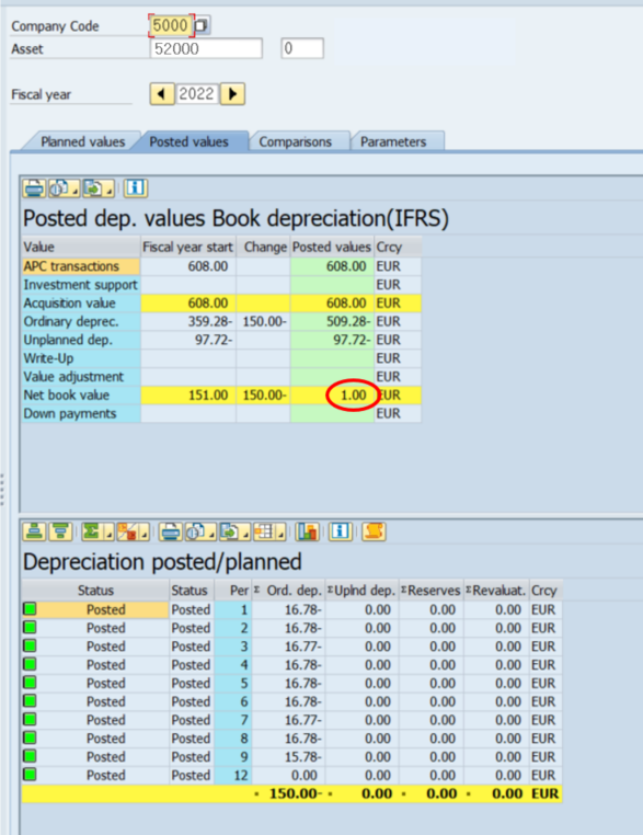 회사코드 5000 의 고정자산 52000의 취득가액은 608 EUR, 감가상각은 2022년 9월로 완료되었고잔존가액은 1.00EUR로 설정되어 있었다.
