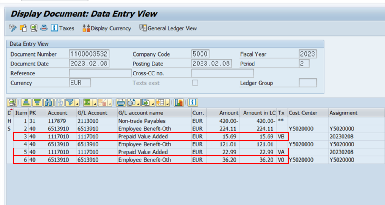 전표번호 1100003532가 바로 위 전표, 깔끔하게 세금 레포트가 작성된 전표인데, 각 세금코드 별로 세금이 한건씩만 인식이 된 것을 볼수 있다.