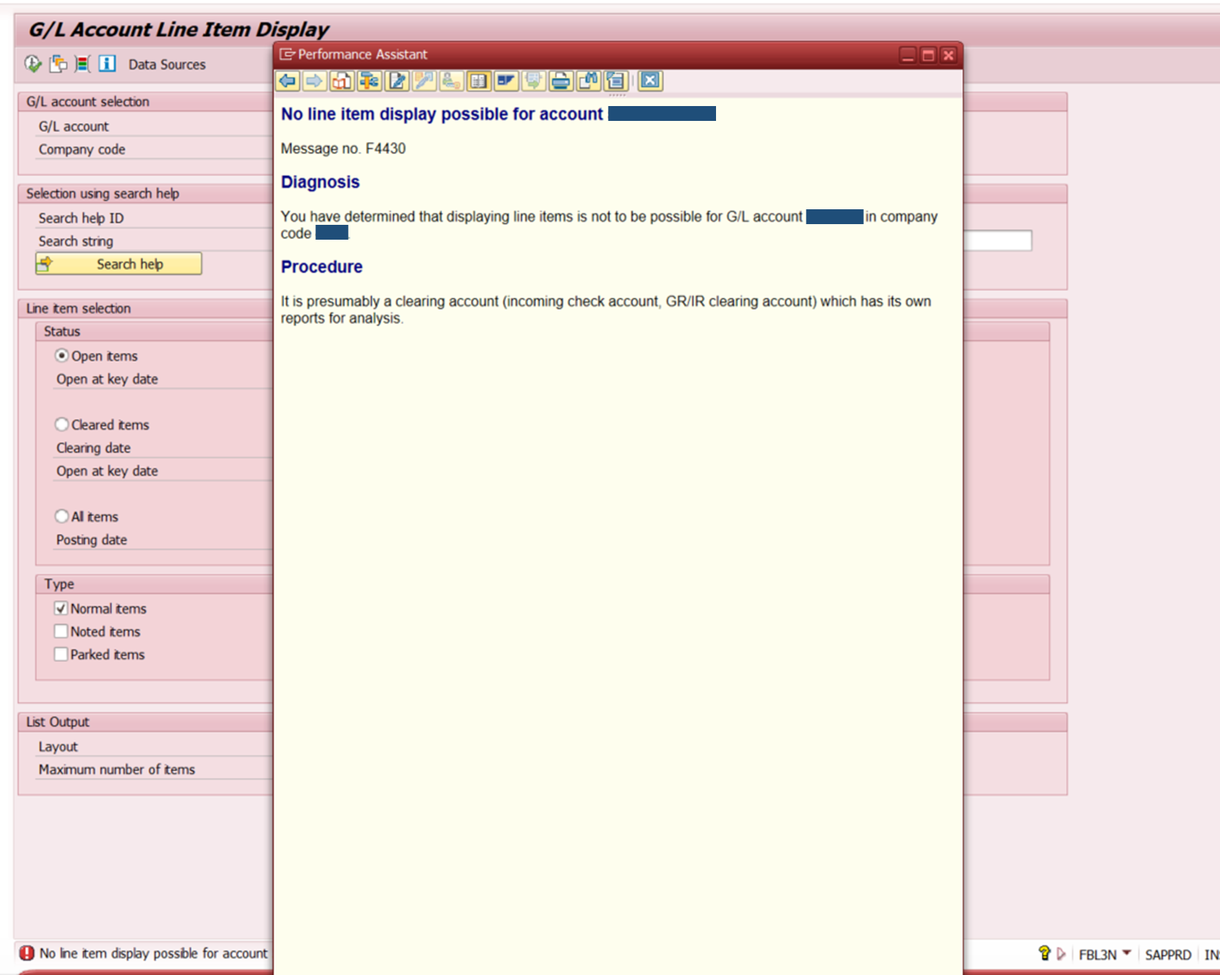 T-Code: FBL3N에서 GL계정을 조회하는데 아래와 같은 에러메시지가 나오면서 조회가 안되는 일이 발생하였다.