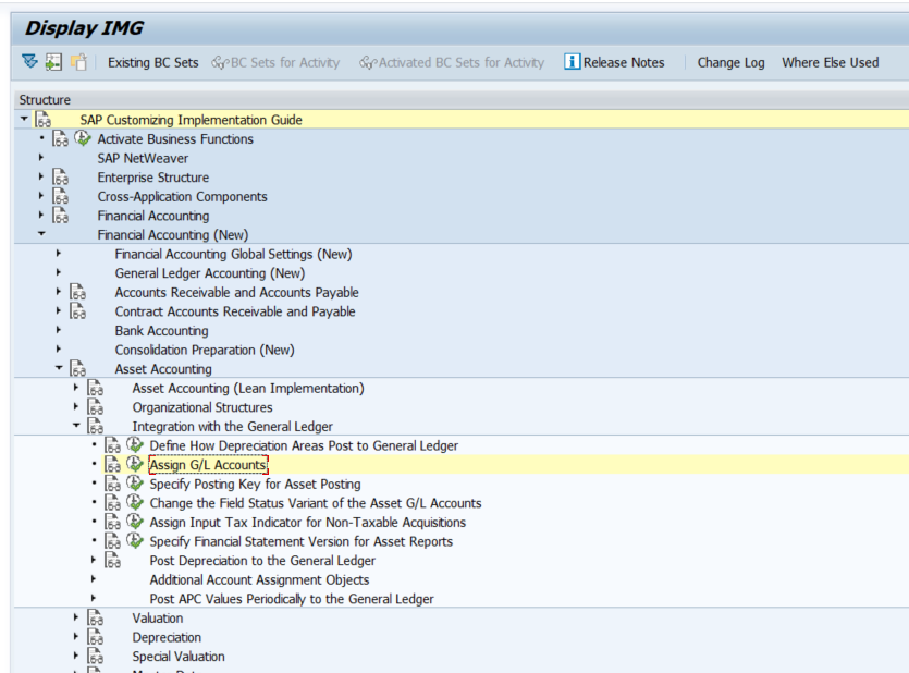SPRO > Financail Account (New) > Asset Accounting > Integration with the General Ledger > Assign G/L Accounts
