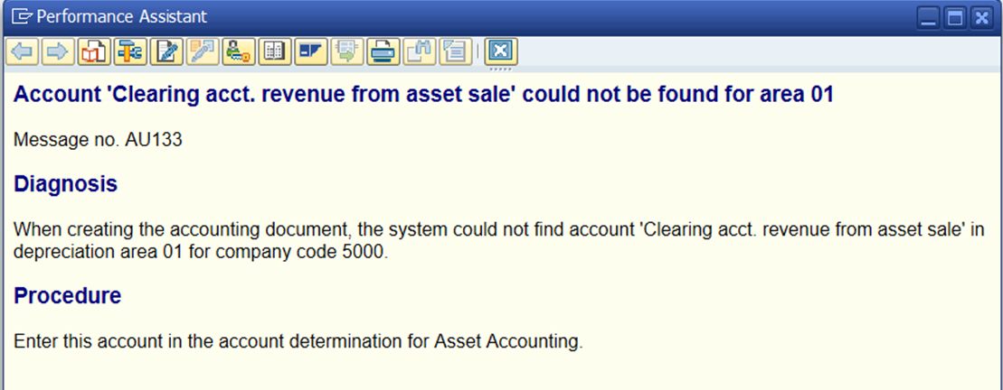 Account 'Clearing acct. revenue from asset sale' could not be found for area 01